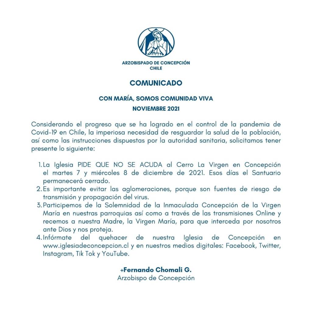 Comunicado Arzobispado de Concepción Publicado porcmontt11/23/2021Publicado en Noticias Comparte esto: Compartir en X (Se abre en una ventana nueva) X Comparte en Facebook (Se abre en una ventana nueva) Facebook Compartir en WhatsApp (Se abre en una ventana nueva) WhatsApp Enviar un enlace a un amigo por correo electrónico (Se abre en una ventana nueva) Correo electrónico Me gusta Cargando...
