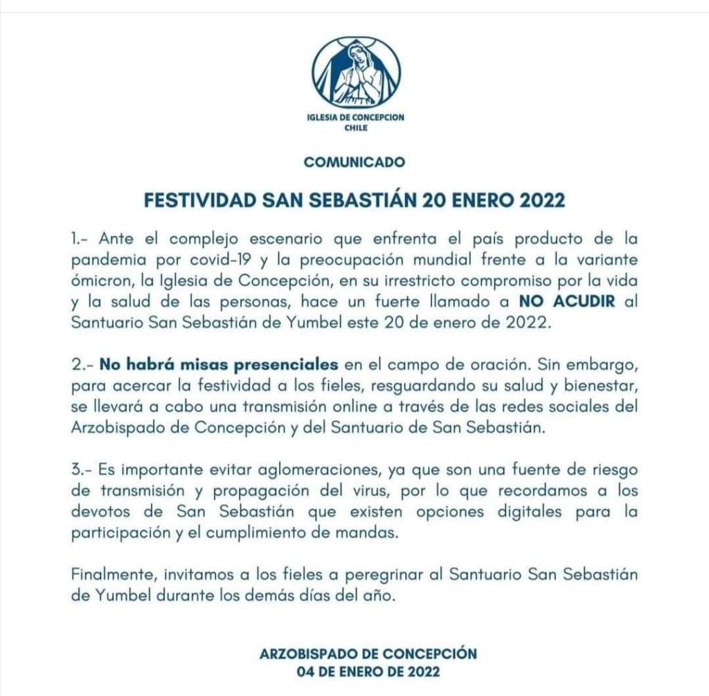 Se informa a la comunidad que la Celebración de San Sebastián no será de forma presencial,en consideración a medidas sanitarias preventivas. Favor difundir.