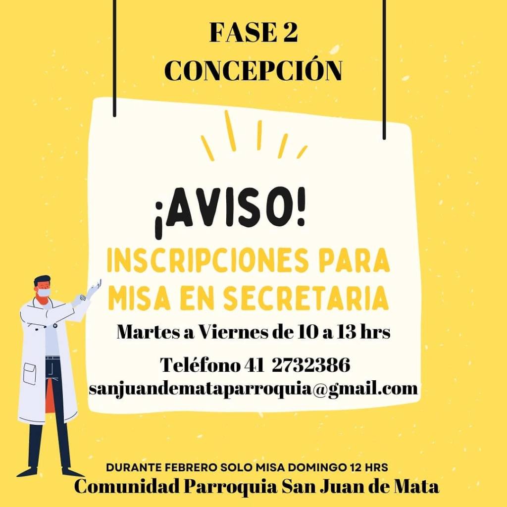 Por cambio de fase de la Comuna y para respetar los aforos y los protocolos. A partir de hoy para asistir a misa presencial se debe hacer previa inscripción en HORARIO DE OFICINA, MARTES A VIERNES DE 10 A 13 HRS, puede ser en la oficina, llamando al 41 2732386 o a través de correo electrónico sanjuandemataparroquia@gmail.com.