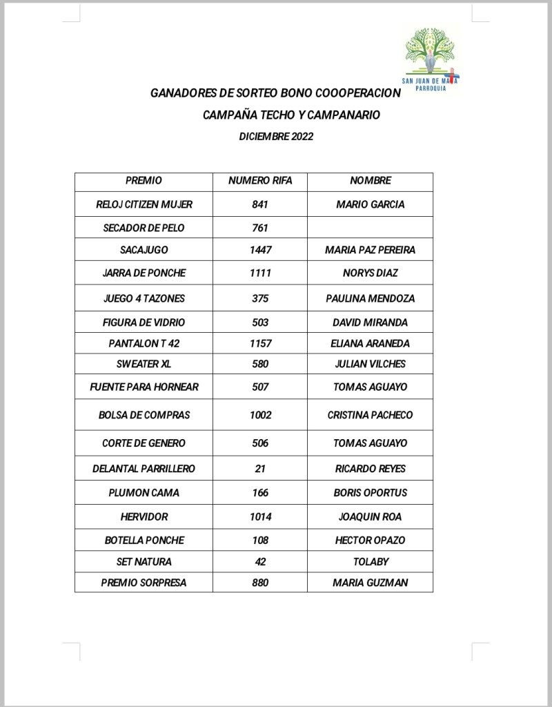 Ayer Viernes se realizó el sorteo y junto con agradecer a todos quienes realizaron su aporte, estamos muy contentos por la participación de la Comunidad y de poder publicar a los ganadores de los premios. Los ganadores seran contactados para retirar su premio, el que será entregado mañana Domingo 25 después de la Misa de 11 hrs.