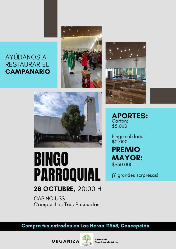 Con total dedicación y entusiasmo están trabajando los integrantes de la comunidad de la Parroquia San Juan de Mata, para afinar los preparativos de un gran evento colaborativo. Se trata de un bingo programado para este sábado 28 de octubre, desde las 20:00 horas, en el Casino de la Universidad San Sebastián (USS), sede Las Tres Pascualas en Concepción.